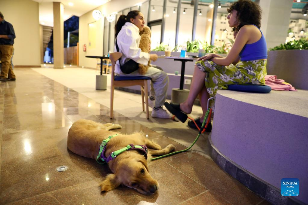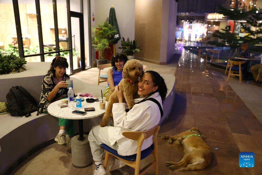People spend time with their dogs at a dog cafe in Giza, Egypt, on May 15, 2022. (Xinhua/Ahmed Gomaa)
