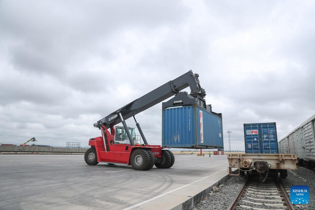 A worker unloads a container from a train in Nairobi freight terminal in Nairobi, Kenya, May 18, 2022. (Xinhua/Long Lei)