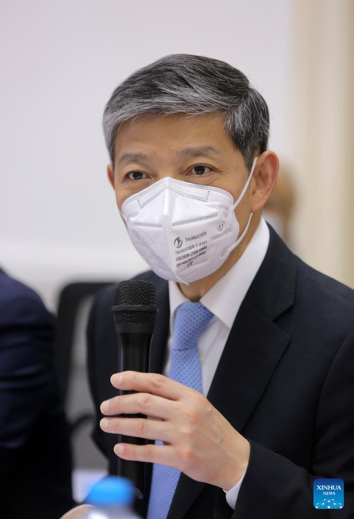 Chinese Ambassador to Egypt Liao Liqiang gives a speech while attending a symposium celebrating the 66th anniversary of the establishment of diplomatic relations between China and Egypt, in Cairo, Egypt, on May 30, 2022. The Egypt-China Friendship Association held a symposium on Monday in Cairo to celebrate the 66th anniversary of the establishment of diplomatic relations between China and Egypt. (Photo by Mohamed Assad/Xinhua)