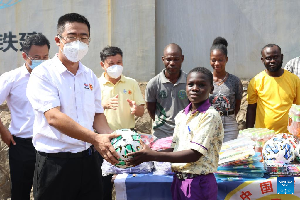 A Chinese company's representative hands a football to a student during a donation ceremony marking International Children's Day at the Christ the King of Kings preparatory school in Accra, Ghana, on June 1, 2022. Two Chinese companies on Wednesday delivered a batch of gifts to some primary school students to celebrate International Children's Day in Jamestown, one of the most poverty-stricken communities in Accra. (Photo by Seth/Xinhua)