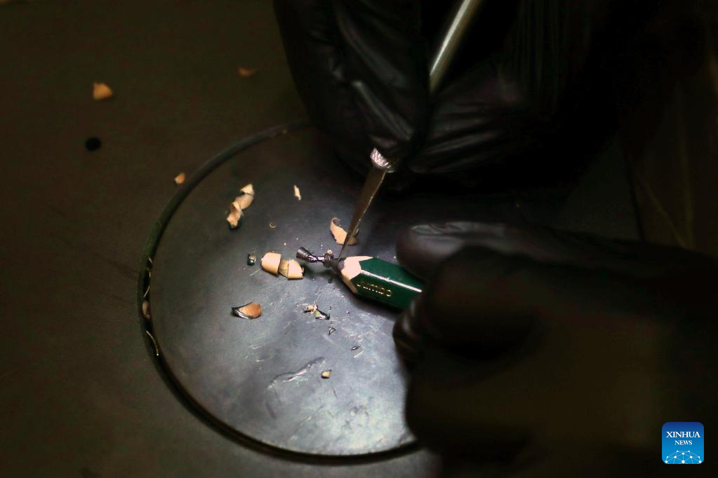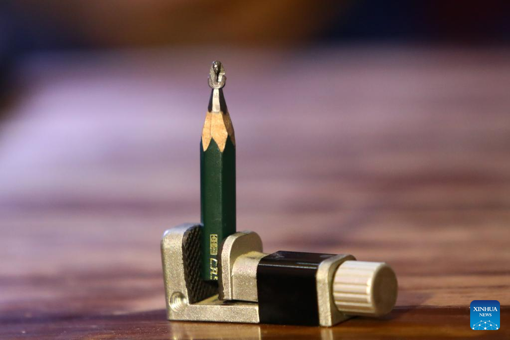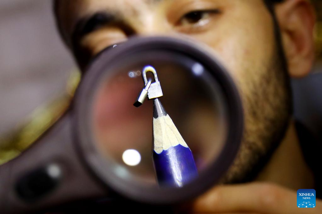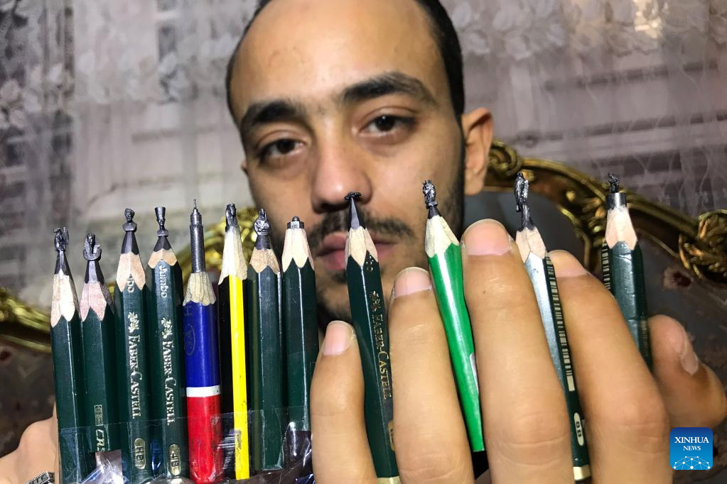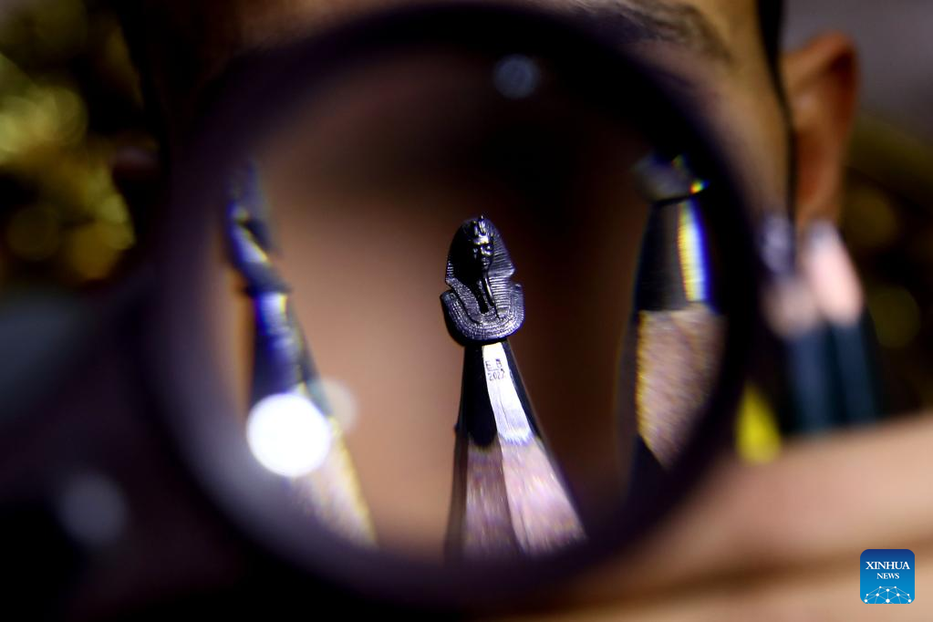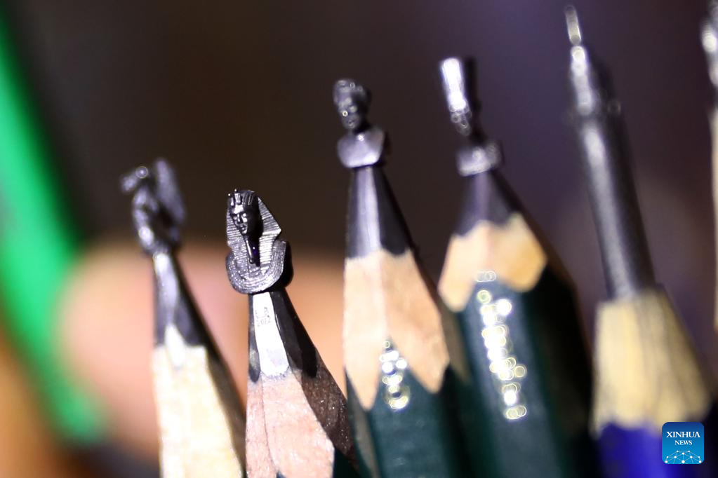 Photo taken on May 25, 2022 shows miniature sculpture works on the pencil tips carved by Ibrahim Bilal at his home in Rosetta, a port city in northern Egypt. (Photo by Ahmed Gomaa/Xinhua)