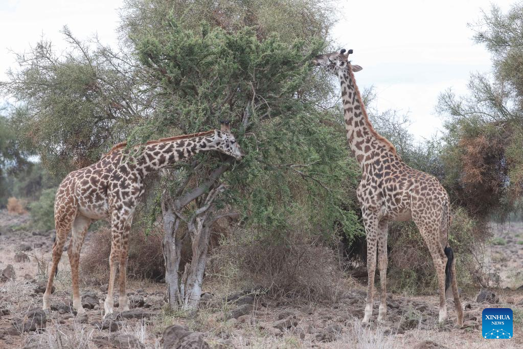 Photo taken on June 12, 2022 shows giraffes at the Amboseli national park, Kenya. (Xinhua/Long Lei)