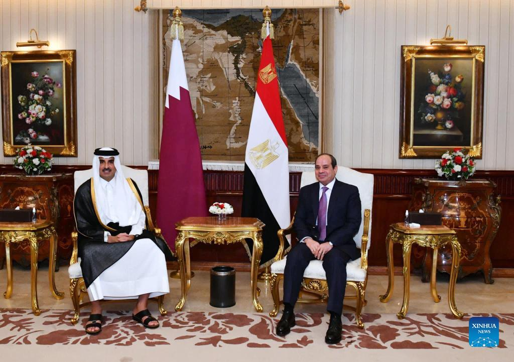 Egyptian President Abdel-Fattah al-Sisi (R) holds a meeting with visiting Qatari Emir Sheikh Tamim bin Hamad Al Thani in Cairo, Egypt, on June 24, 2022. The Qatari emir arrived in Cairo on Friday for his first visit to Egypt since the two countries restored diplomatic ties last year. (Egyptian Presidency/Handout via Xinhua)