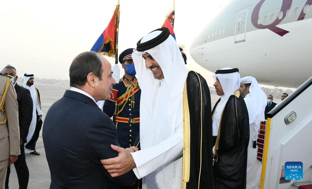 Egyptian President Abdel-Fattah al-Sisi (R) welcomes Qatari Emir Sheikh Tamim bin Hamad Al Thani upon his arrival at the Cairo International Airport in Cairo, Egypt, on June 24, 2022. The Qatari emir arrived in Cairo on Friday for his first visit to Egypt since the two countries restored diplomatic ties last year. (Egyptian Presidency/Handout via Xinhua)