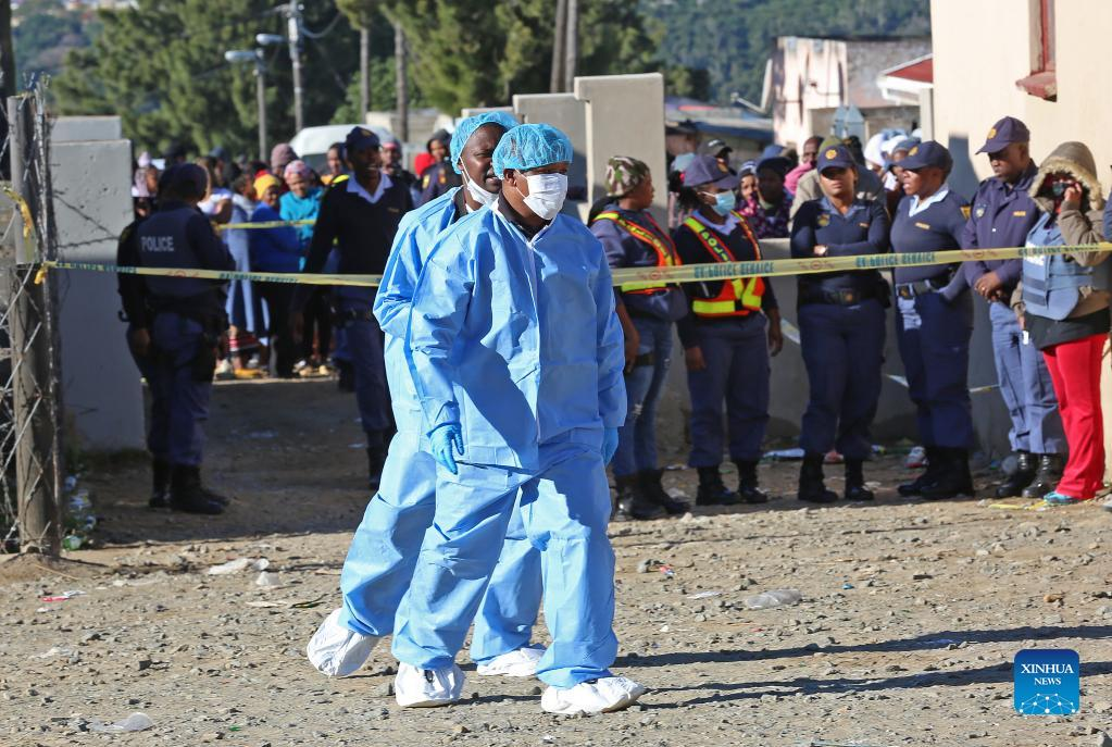 Forensic experts work outside a tavern for the death of teenagers in East London, South Africa, on June 26, 2022. South African President Cyril Ramaphosa on Sunday afternoon mourned for the death of "22 teenagers" at a tavern, or pub, in East London, Eastern Cape Province, in the early hours of the morning. South African police are still investigating the case and the cause is unclear. The presidency statement didn't give the cause of the incident, saying the president is waiting for more information. (Photo by Oluthando Mthimkhulu/Xinhua)