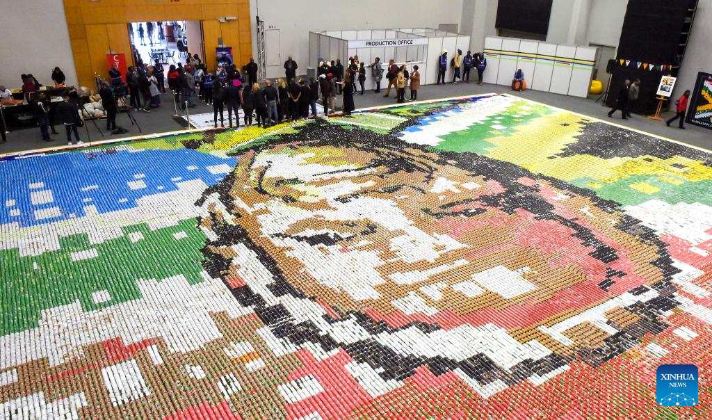 People use food cans to lay out a mosaic in the shape of Nelson Mandela's portrait to mark International Nelson Mandela Day in Cape Town, South Africa, on July 18, 2022. (Photo by Xabiso Mkhabela/Xinhua)