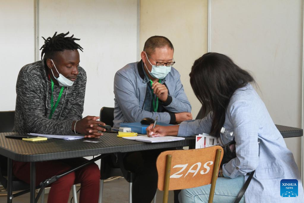 A job seeker interacts with a potential employer at a job fair in Harare, Zimbabwe, on Aug. 2, 2022. The two-day Zimbabwe Job Fair opened Tuesday. Hosted by the China Africa Economic and Culture Exchange Research Center and Victory Milestone Recruitment, the event lived up to its billing as scores of job seekers exchanged notes with potential employers and left the curriculum vitae (CV) for possible placements. (Xinhua/Tafara Mugwara)