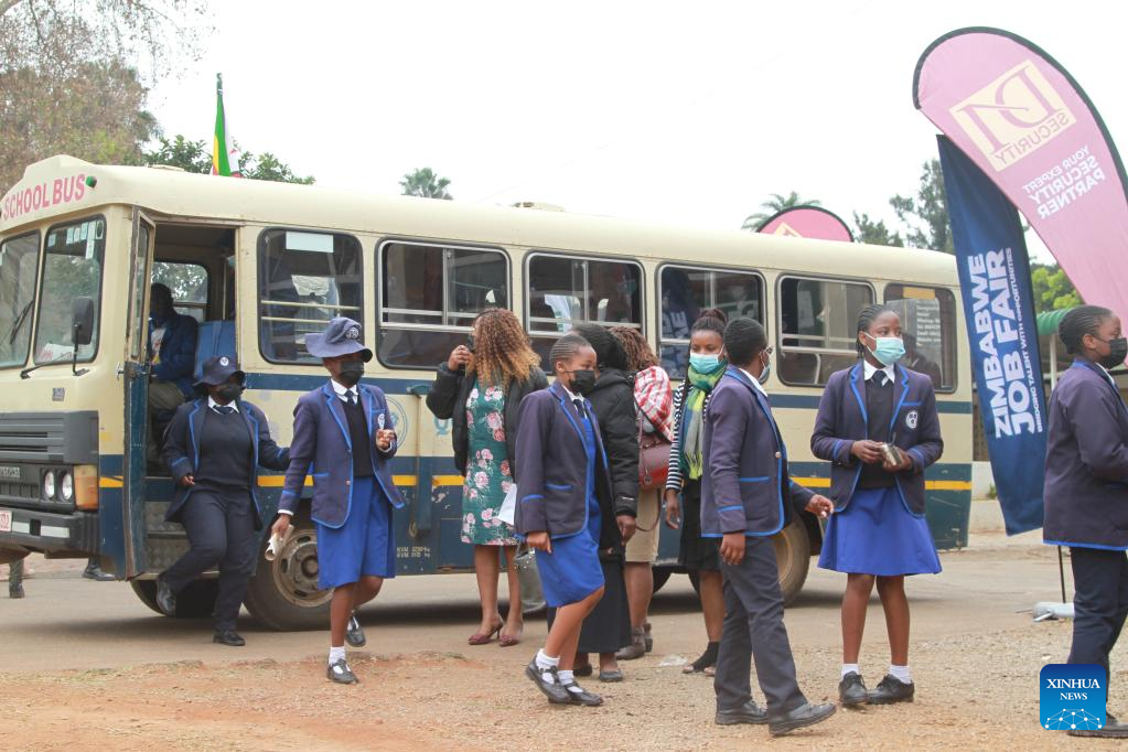 High school students seeking career guidance arrive to attend a job fair in Harare, Zimbabwe, on Aug. 2, 2022. The two-day Zimbabwe Job Fair opened Tuesday. Hosted by the China Africa Economic and Culture Exchange Research Center and Victory Milestone Recruitment, the event lived up to its billing as scores of job seekers exchanged notes with potential employers and left the curriculum vitae (CV) for possible placements. (Xinhua/Tafara Mugwara)