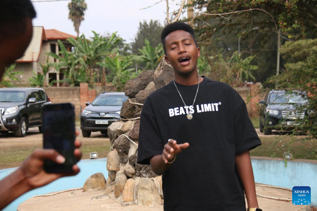 Pacifique Izabayo sings a Chinese song for sharing a short video on Douyin in Kigali, Rwanda, on Aug. 13, 2022. Rwandan youth, Pacifique Izabayo, has become a hit on Douyin, the Chinese version of TikTok, for singing Chinese songs while showing Rwandan rural life. (Photo by Huang Wanqing/Xinhua)