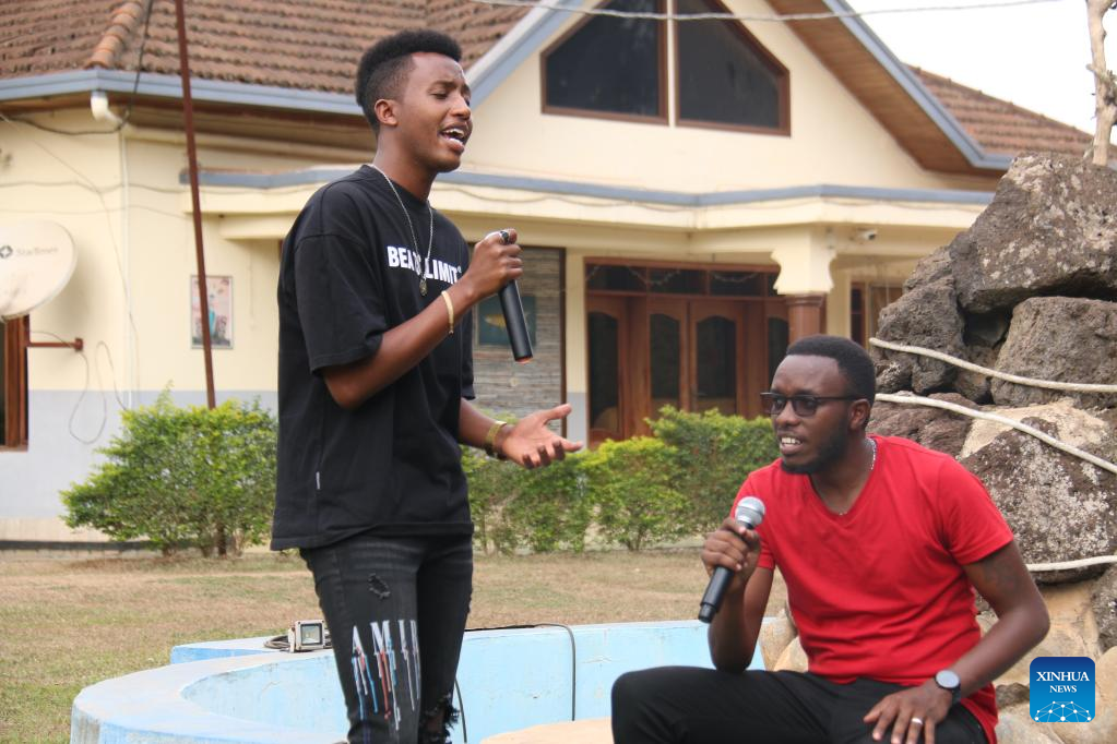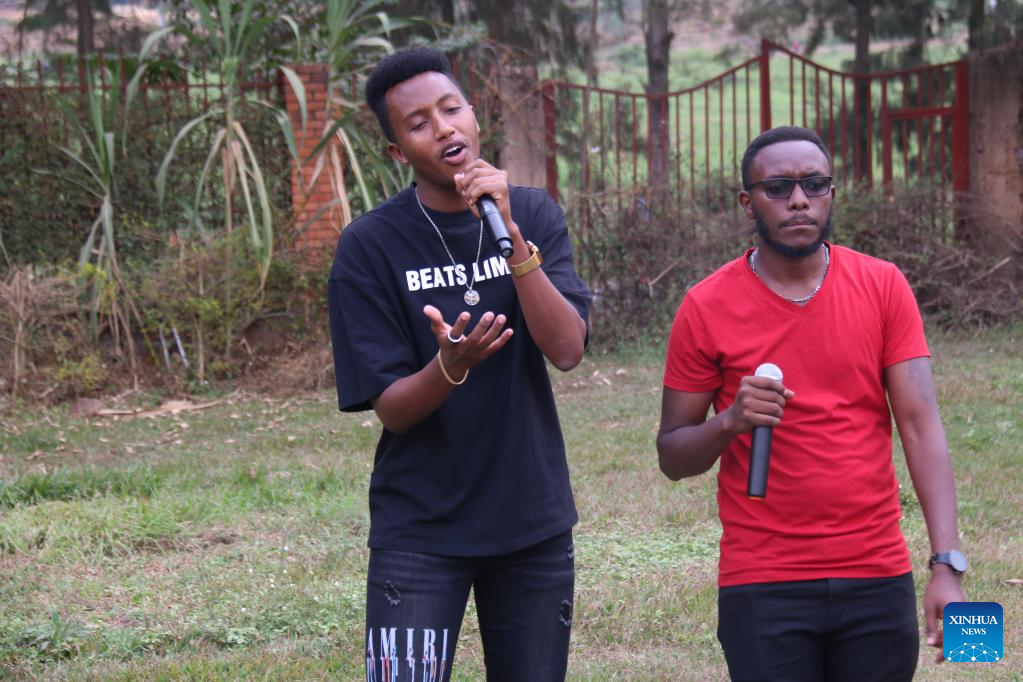 Pacifique Izabayo (L) and his team member sing a Chinese song together for sharing a short video on Douyin in Kigali, Rwanda, on Aug. 13, 2022. Rwandan youth, Pacifique Izabayo, has become a hit on Douyin, the Chinese version of TikTok, for singing Chinese songs while showing Rwandan rural life. (Photo by Huang Wanqing/Xinhua)