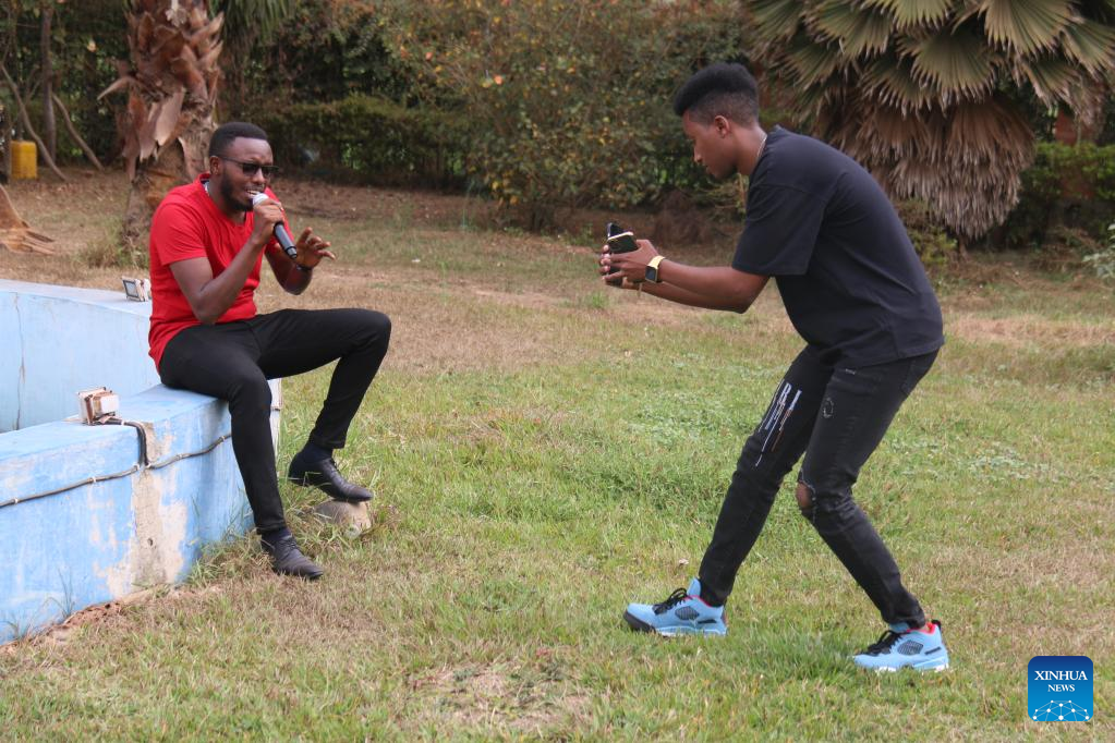 Pacifique Izabayo (R) shoots a video for his team member in Kigali, Rwanda, on Aug. 13, 2022. Rwandan youth, Pacifique Izabayo, has become a hit on Douyin, the Chinese version of TikTok, for singing Chinese songs while showing Rwandan rural life. (Photo by Huang Wanqing/Xinhua)