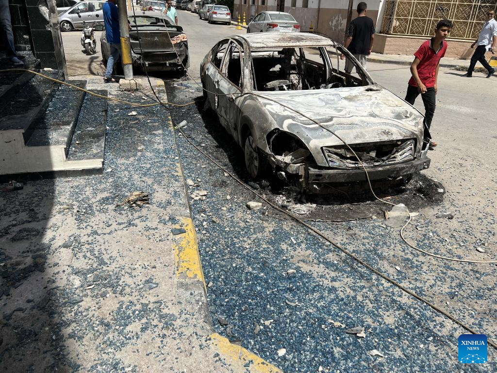 A damaged vehicle is seen after clashes in central Tripoli, Libya, on Aug. 28, 2022. The death toll of the clashes in the Libyan capital Tripoli has increased to 23, the country's Health Ministry said Saturday.