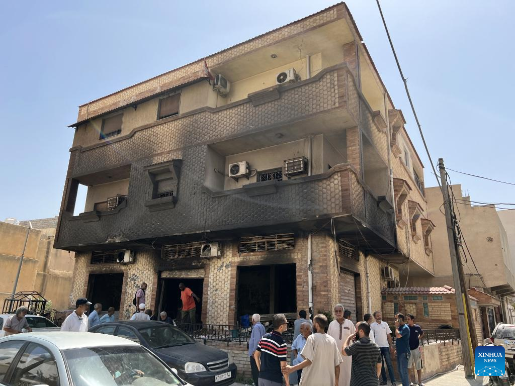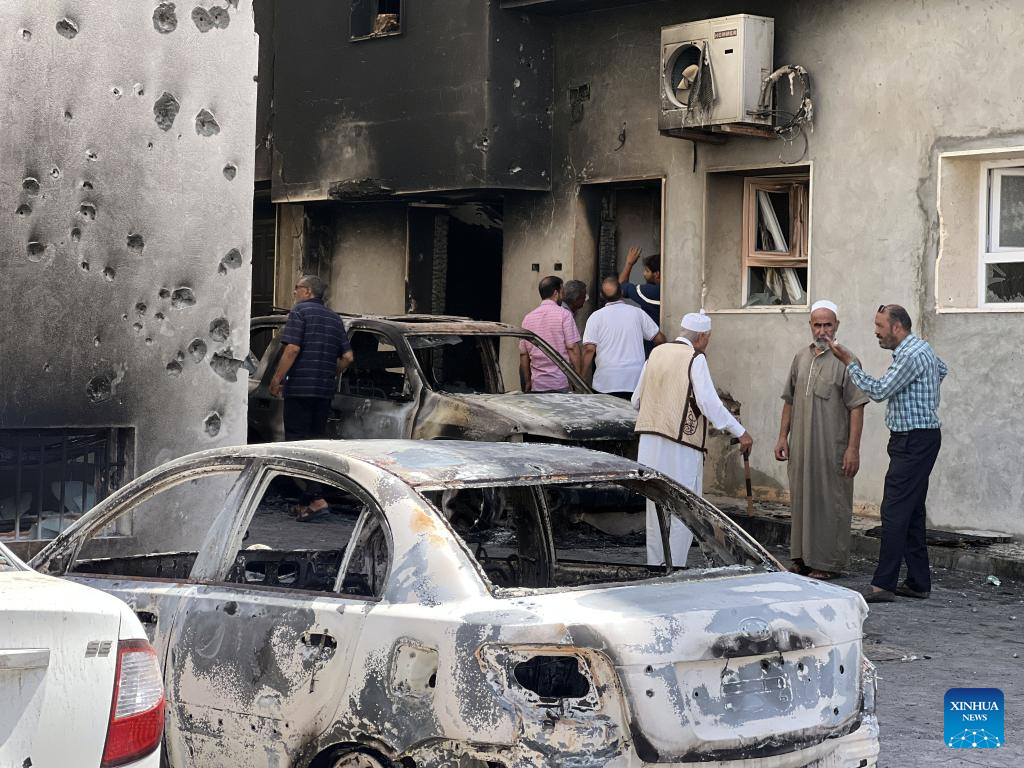 People are seen near the damaged house after clashes in central Tripoli, Libya, on Aug. 28, 2022. The death toll of the clashes in the Libyan capital Tripoli has increased to 23, the country's Health Ministry said Saturday.
