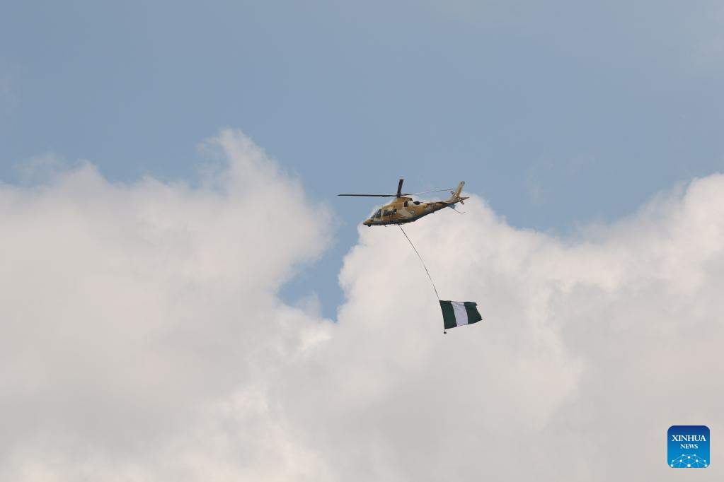 A helicopter carries a Nigerian national flag during celebrations marking Nigeria's Independence Day in Abuja, Nigeria, Oct. 1, 2022. (Photo by Emma Houston/Xinhua)