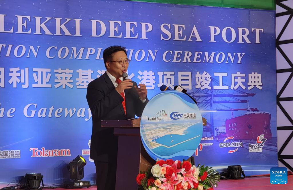 Cui Jianchun, Chinese ambassador to Nigeria, speaks at the handing over ceremony of the Lekki Deep Sea Port in Lagos, Nigeria, Oct. 31, 2022. China Harbor Engineering Company Ltd (CHEC) on Monday handed over Nigeria's first deep sea port to the government after the completion of the huge maritime project in the country's economic hub city of Lagos. (Xinhua/Guo Jun)