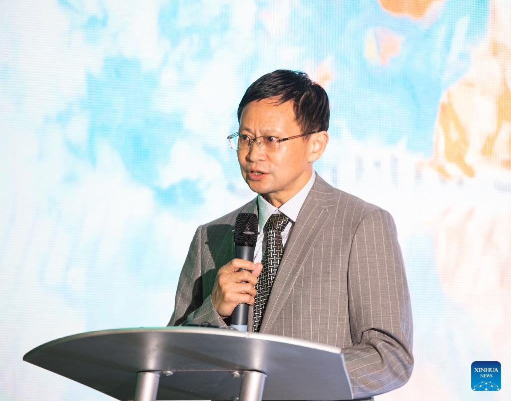 Tang Jianjun, cultural counselor of the Chinese embassy in Kenya, speaks during the launching ceremony of the Swahili drama series KIU, in Nairobi, Kenya, Dec. 8, 2022. Chinese pay television firm StarTimes on Thursday evening launched the new drama series in Kenya amid its growing efforts to produce local content. (Xinhua/Li Yahui)