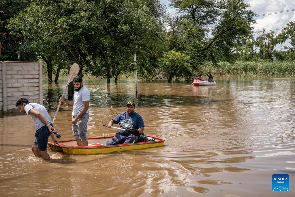 Flood-affected people move by boat in a flooded area after heavy rain in Johannesburg, South Africa, Dec. 9, 2022. (Photo by Shiraaz Mohamed/Xinhua)