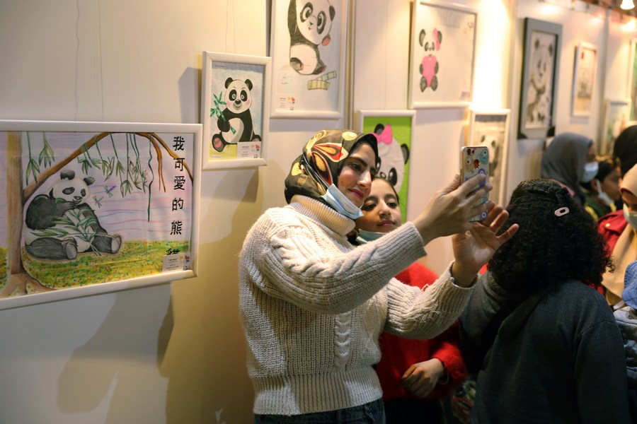 People take selfie during the exhibition of works of the "I love panda" drawing contest in Cairo, Egypt, on Dec. 7, 2022. (Xinhua/Ahmed Gomaa)