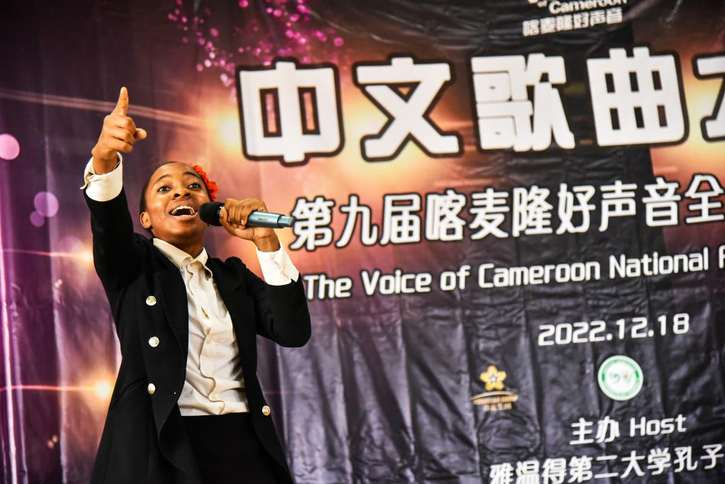 A contestant sings a Chinese song during a Chinese singing competition at the Confucius Institute of the University of Yaounde II in Soa, Cameroon, Dec. 18, 2022. (Photo by Kepseu/Xinhua)