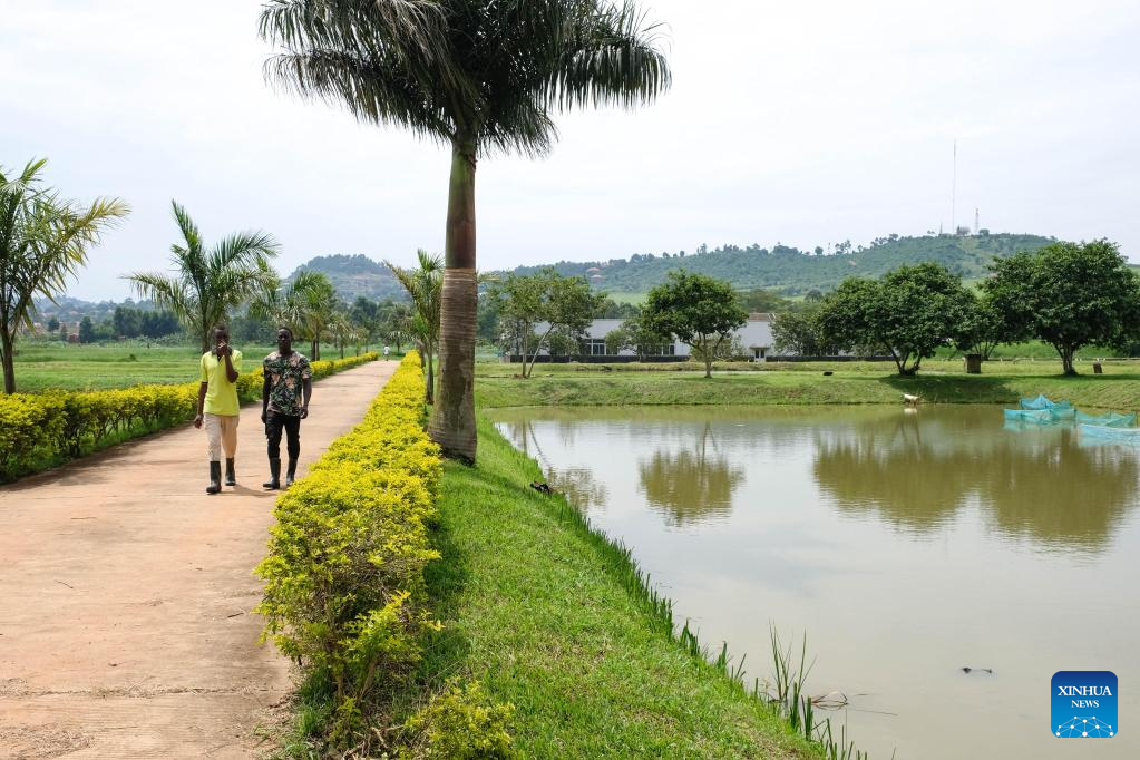 Local workers walk by the fishponds at the Aquaculture Research and Development Centre in Kajjansi, Wakiso District, Uganda, Dec. 21, 2022. (Photo by Hajarah Nalwadda/Xinhua)