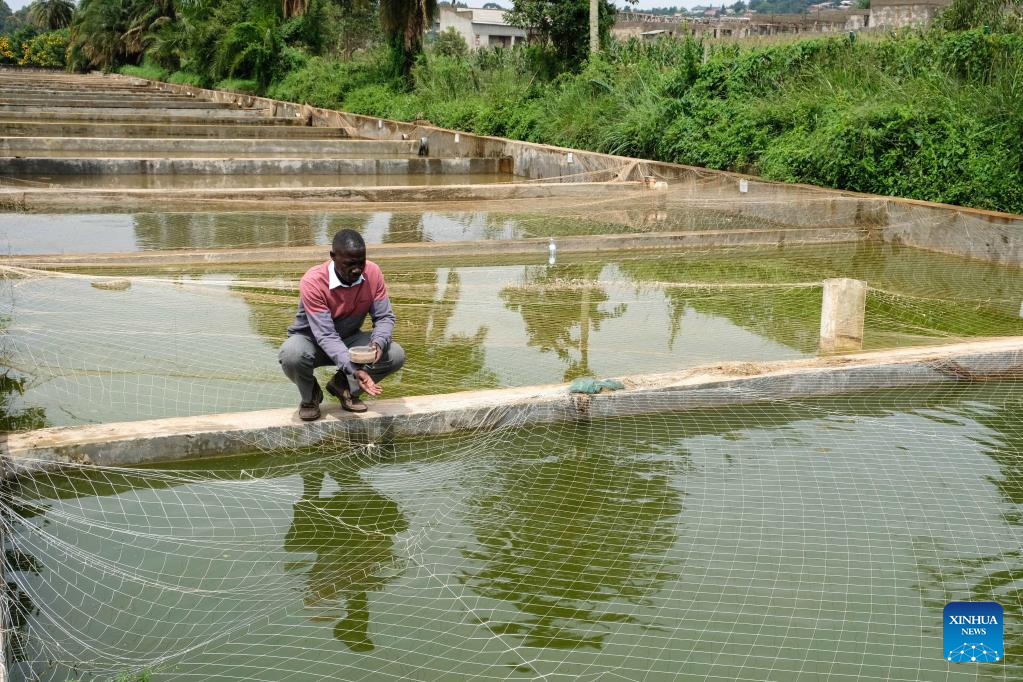 Godfrey Kityo, a fish breeding technician, feeds fish in a fish pond at the Aquaculture Research and Development Centre in Kajjansi, Wakiso District, Uganda, Dec. 21, 2022. (Photo by Hajarah Nalwadda/Xinhua)
