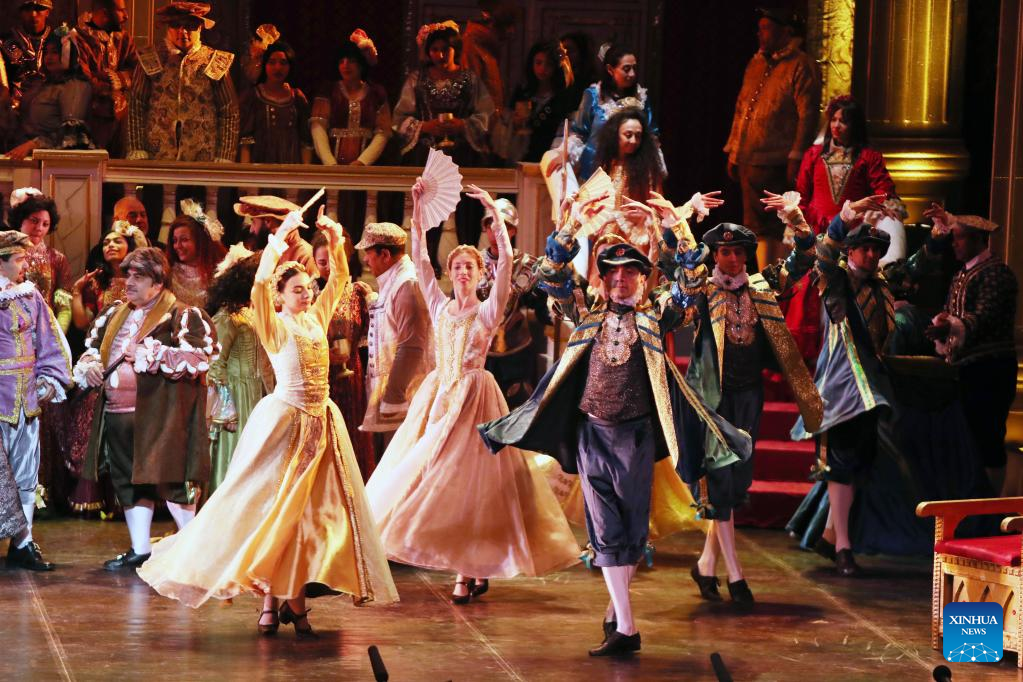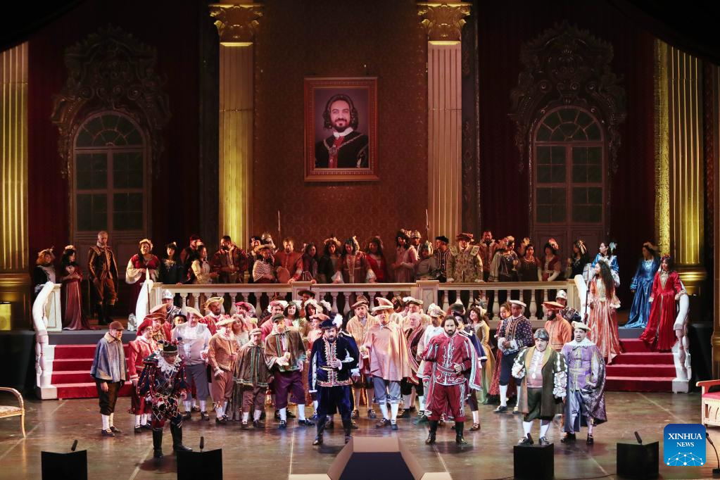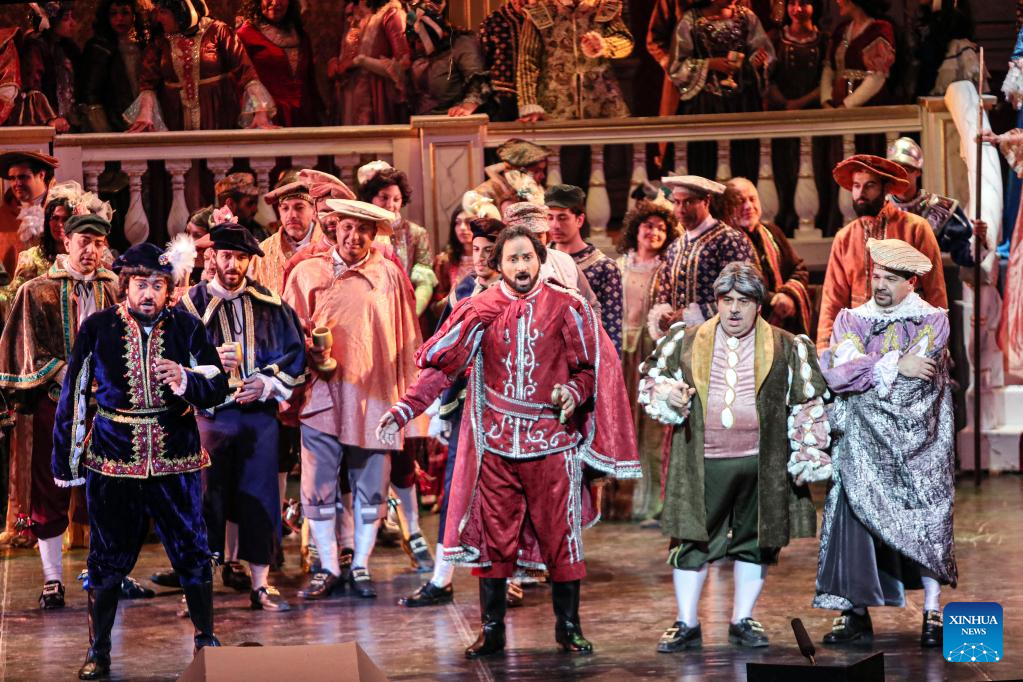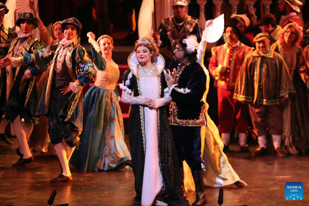 Artists perform the opera Rigoletto at Cairo Opera House in Cairo, Egypt, on Jan. 12, 2023. Seats were all occupied at the main hall of Cairo Opera House as opera lovers watched Italian composer Giuseppe Verdi's masterpiece Rigoletto, which was staged in Cairo again after more than 150 years. Based on the 1832 play Le roi s'amuse (The King Has Fun) by French dramatist Victor Hugo, Rigoletto was first staged in Egypt in 1869 to mark the country's celebration of the opening of the Suez Canal. (Xinhua/Ahmed Gomaa)