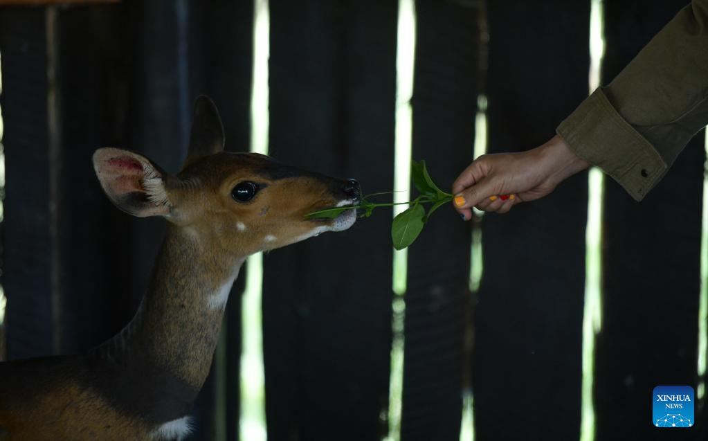 A tourist feeds a bushbuck at the Animal Orphanage in Mount Kenya Wildlife Conservancy in Nanyuki, Kenya, Feb. 4, 2023. The orphanage provides shelter and care for the injured, neglected, abused or frightened wild animals. (Xinhua/Han Xu)