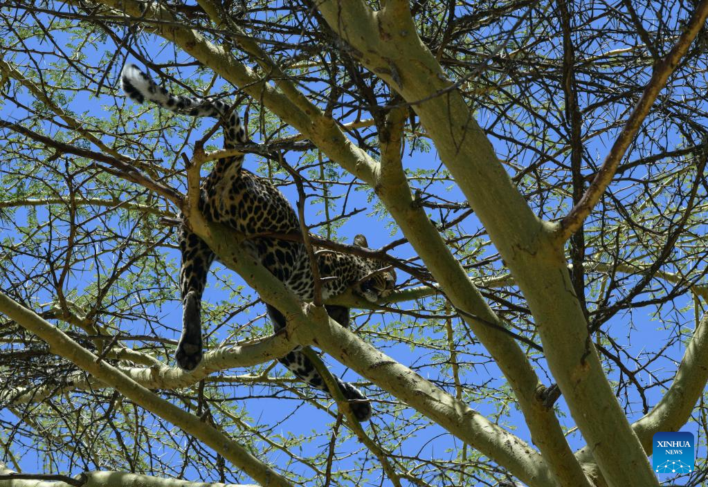 A leopard rests on the tree at the Animal Orphanage in Mount Kenya Wildlife Conservancy in Nanyuki, Kenya, Feb. 4, 2023. The orphanage provides shelter and care for the injured, neglected, abused or frightened wild animals. (Xinhua/Han Xu)