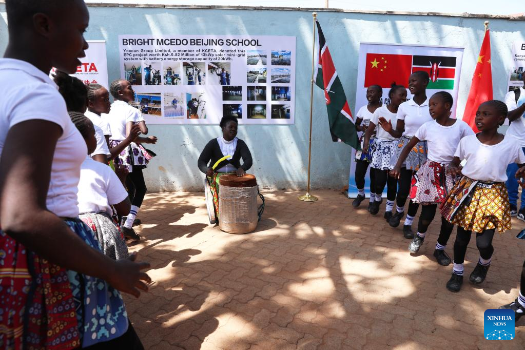 Students dance during a donation ceremony at Mcedo Beijing School in Mathare slums in Nairobi, Kenya, on Feb. 14, 2023. (Xinhua/Dong Jianghui)