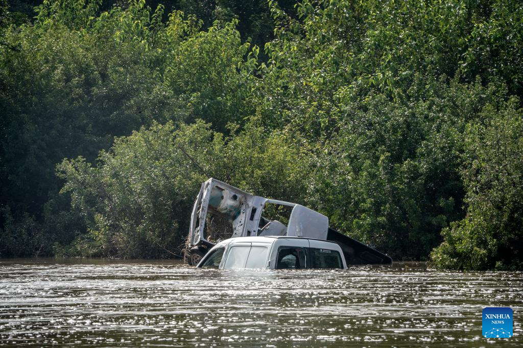 A vehicle is submerged in water in Lochvaal, South Africa, Feb. 19, 2023. The Vaal dam exceeded its maximum capacity due to heavy rainfall and caused floods in the Vaal River. (Photo by Shiraaz Mohamed/Xinhua)