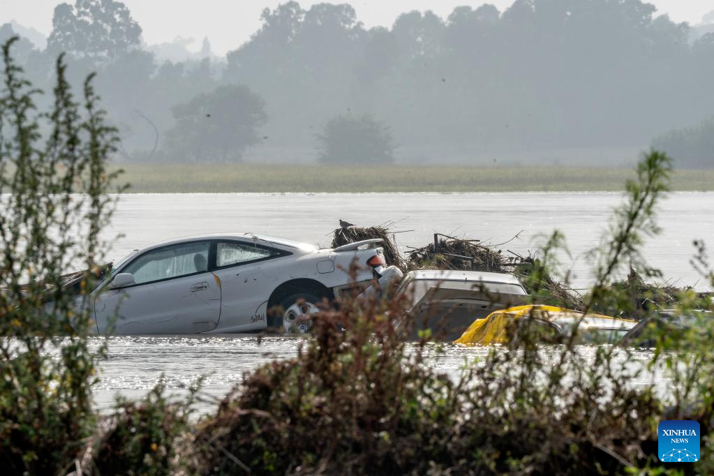 Vehicles are submerged in water in Lochvaal, South Africa, Feb. 19, 2023. The Vaal dam exceeded its maximum capacity due to heavy rainfall and caused floods in the Vaal River. (Photo by Shiraaz Mohamed/Xinhua)