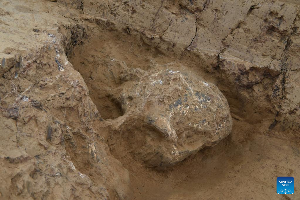 This file photo shows a fossilized skull unearthed from a Paleolithic period site in Shiyan, central China's Hubei Province. Six historic sites dating back to the Paleolithic period at the earliest were listed as China's new archaeological discoveries of 2022 at a forum on Wednesday. (Xinhua)