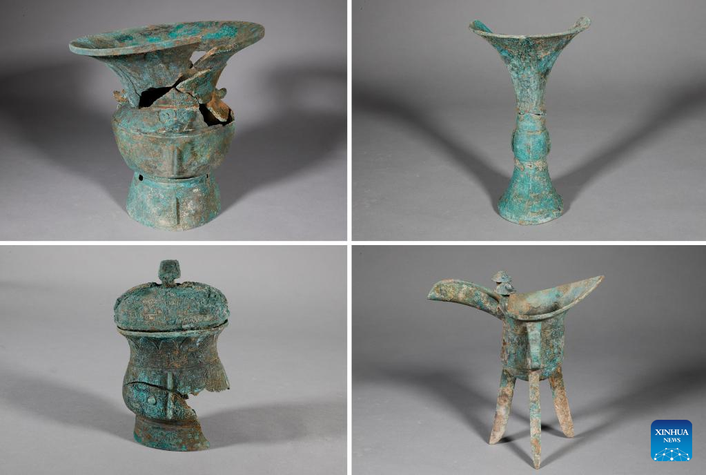 This combo photo shows bronze wares unearthed from the royal tomb area and surrounding relics in the Yin Ruins dating back to the Shang Dynasty (1600-1046 B.C.), in the northwest suburbs of Anyang, central China's Henan Province. Six historic sites dating back to the Paleolithic period at the earliest were listed as China's new archaeological discoveries of 2022 at a forum on Wednesday. (Xinhua)