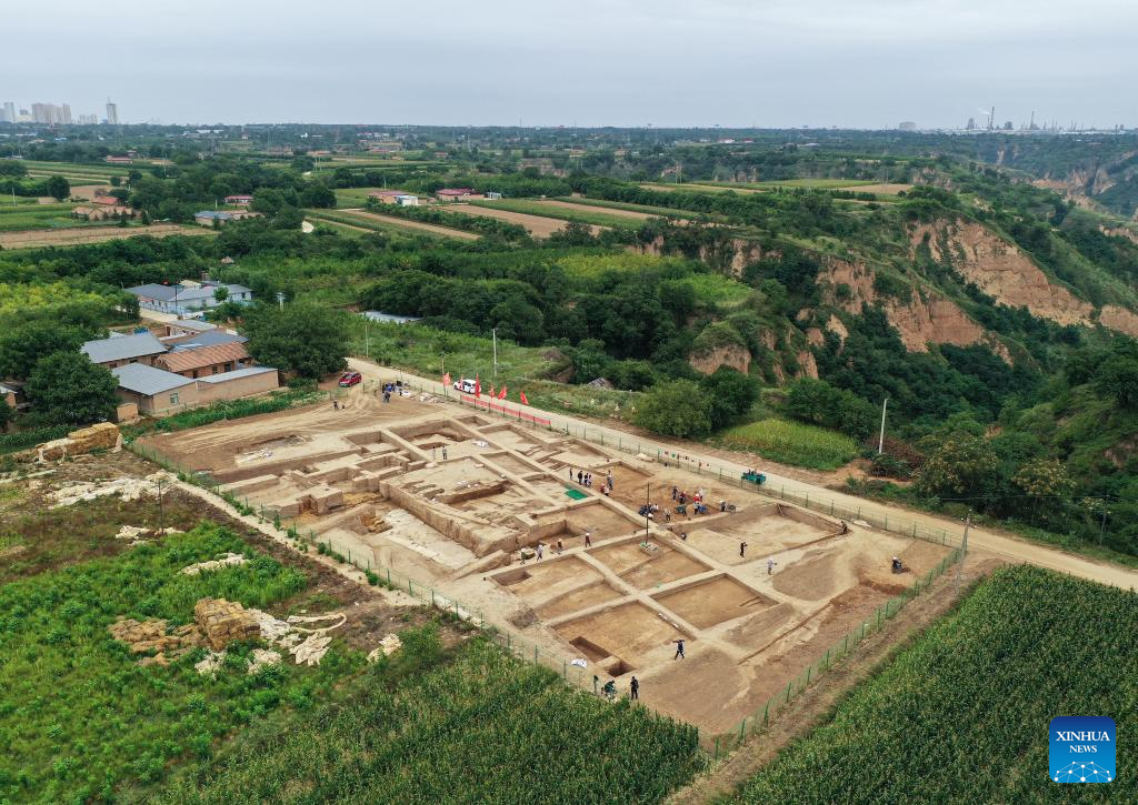 This aerial photo taken on Aug. 23, 2022 shows a Neolithic ruins in Qingyang, northwest China's Gansu Province. Six historic sites dating back to the Paleolithic period at the earliest were listed as China's new archaeological discoveries of 2022 at a forum on Wednesday. (Xinhua/Li He)