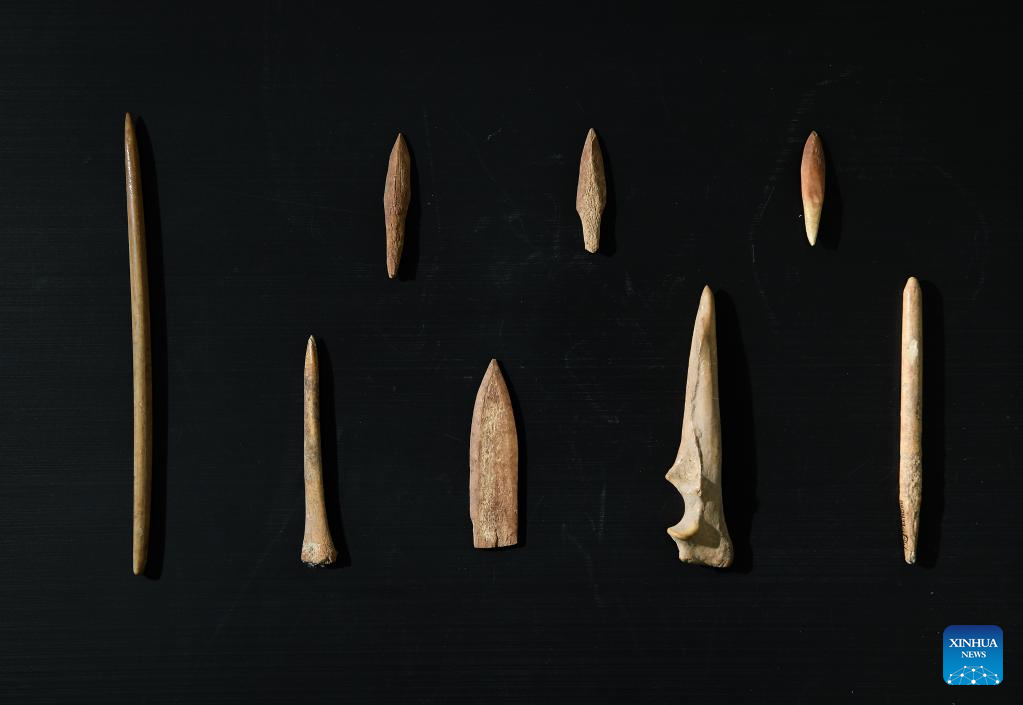 This photo taken on Aug. 25, 2022 shows bone artifacts unearthed from a Neolithic ruins in Qingyang, northwest China's Gansu Province. Six historic sites dating back to the Paleolithic period at the earliest were listed as China's new archaeological discoveries of 2022 at a forum on Wednesday. (Xinhua/Li He)