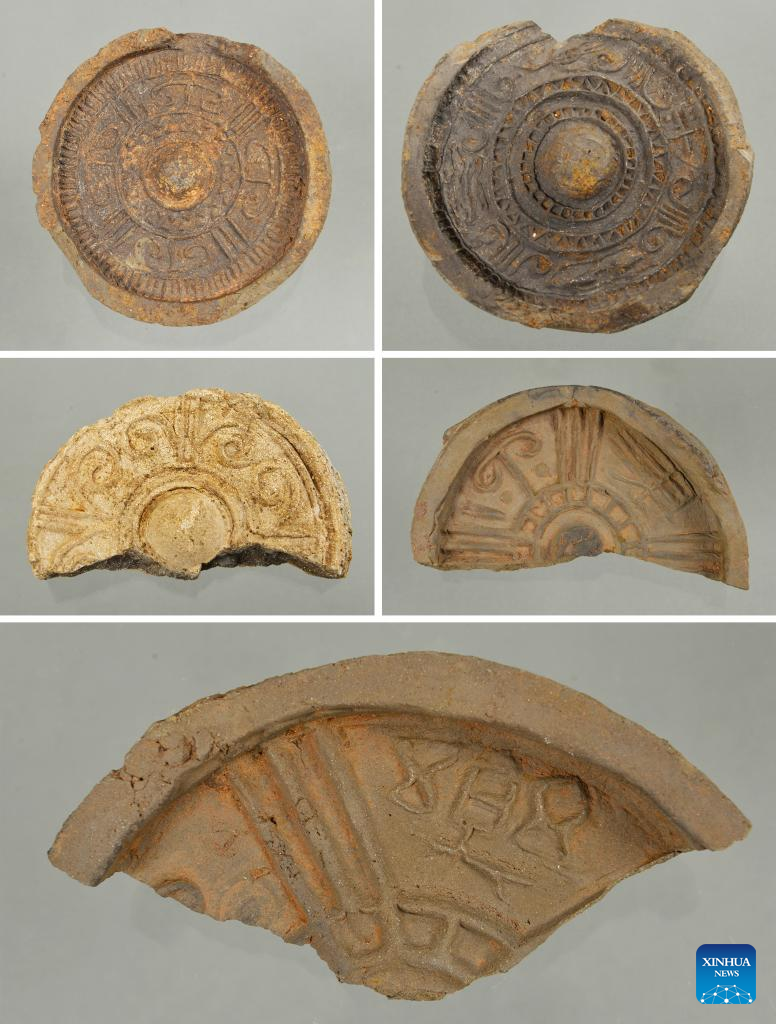 This combo photo shows eaves tiles unearthed from Hebosuo relics site dating back to the Bronze Age, in Kunming, southwest China's Yunnan Province. Six historic sites dating back to the Paleolithic period at the earliest were listed as China's new archaeological discoveries of 2022 at a forum on Wednesday. (Xinhua)