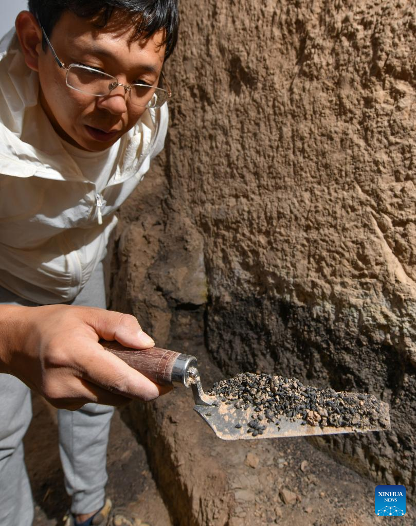 An archaeologist shows carbonized rice unearthed from a Neolithic ruins in Qingyang, northwest China's Gansu Province, on Aug. 23, 2022. Six historic sites dating back to the Paleolithic period at the earliest were listed as China's new archaeological discoveries of 2022 at a forum on Wednesday. (Xinhua/Li He)
