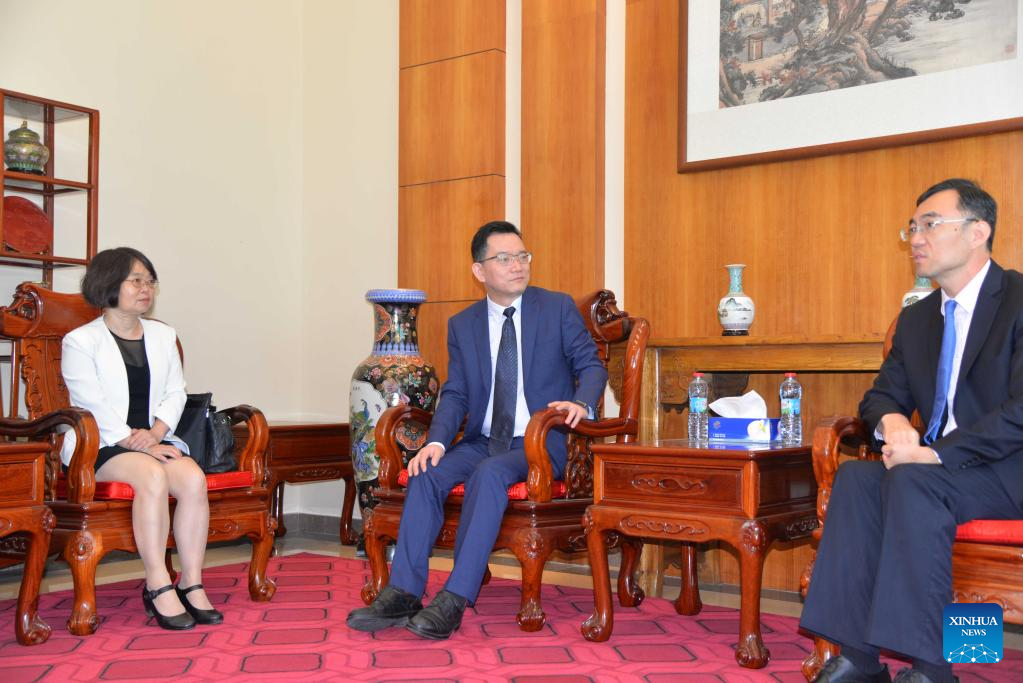 Huo Wei(R), charge d'affaires at the Chinese embassy in Madagascar meets with Liu Dongyun(C), the head of the 23rd Chinese medical team in Madagascar, and Li Sumei(L), the head of the 22nd Chinese medical team in Madagascar at the Chinese embassy in Antananarivo, Madagascar, March 9, 2023. (Photo by Sitraka Rajaonarison/Xinhua)