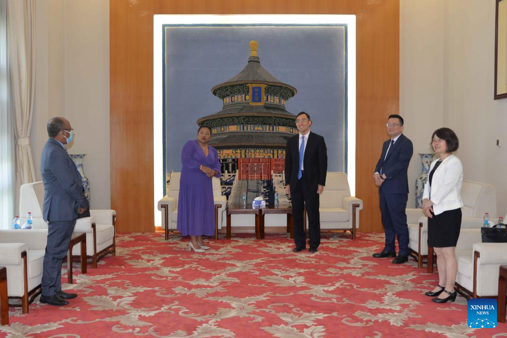 Onivelo Gabhy Andriamanantena(2nd, L), chief of staff of Madagascar's Ministry of Public Health and Huo Wei(3rd, R), charge d'affaires at the Chinese embassy in Madagascar meet with Liu Dongyun(2nd, R), the head of the 23rd Chinese medical team in Madagascar, and Li Sumei(1st, R), the head of the 22nd Chinese medical team in Madagascar at the Chinese embassy in Antananarivo, Madagascar, March 9, 2023. (Photo by Sitraka Rajaonarison/Xinhua)