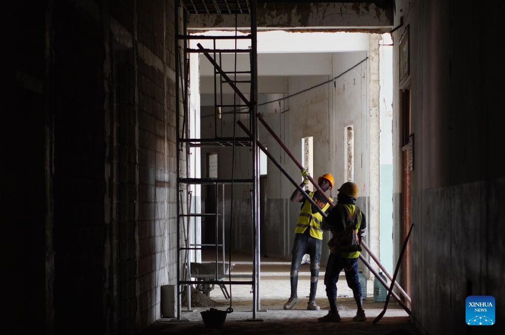 Construction workers are engaged in a China-financed rehabilitation project at the Leopold Sedar Senghor Stadium in Dakar, Senegal, March 22, 2023.