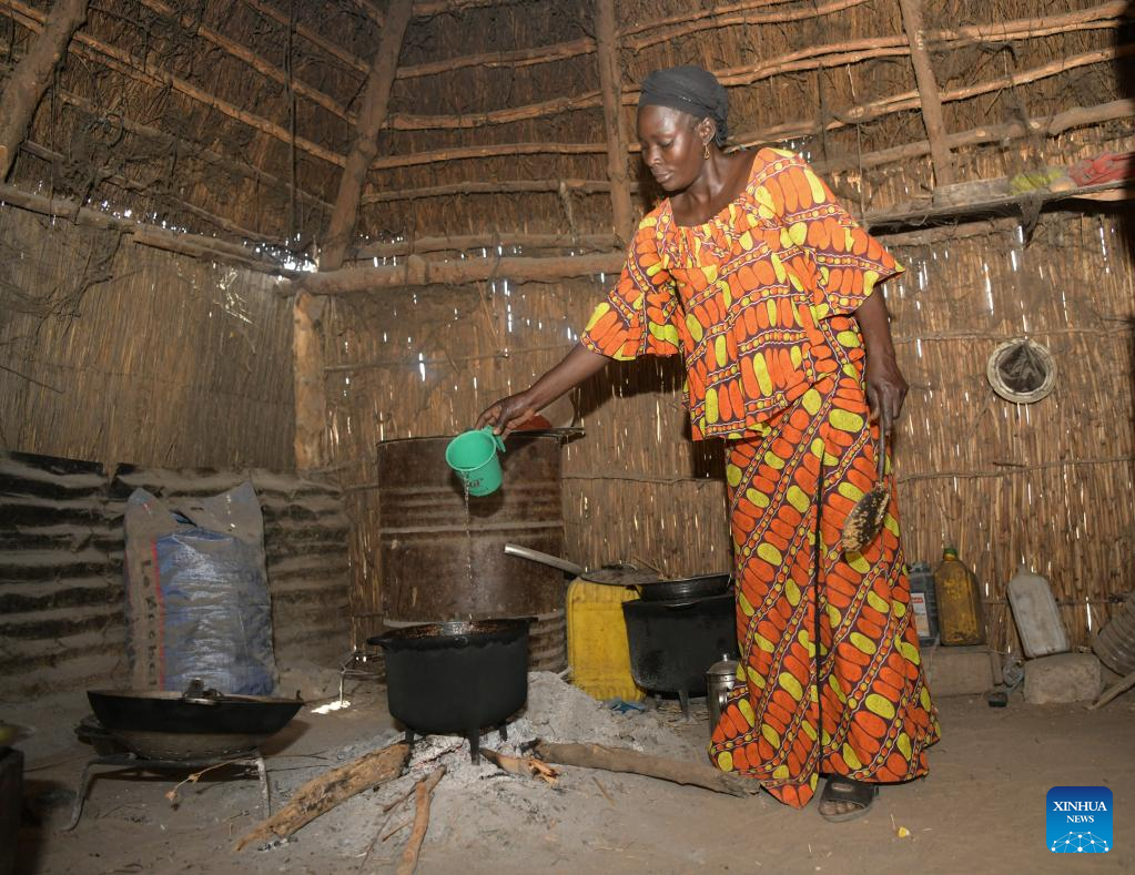 Nogaye yak, Mamadou Dieng's wife, cooks at home in Tenefoul Toucouleur Village, Diourbel, Senegal, March 20, 2023. Mamadou Dieng, 40, an employee of the Chinese construction company CGCOC Group Senegal Branch, has been responsible for maintaining a Chinese-aided well in Tenefoul Toucouleur Village. Checking the machine's functions and filling the engine with diesel, Dieng's work may seem simple and tedious, but means a lot to the locals.