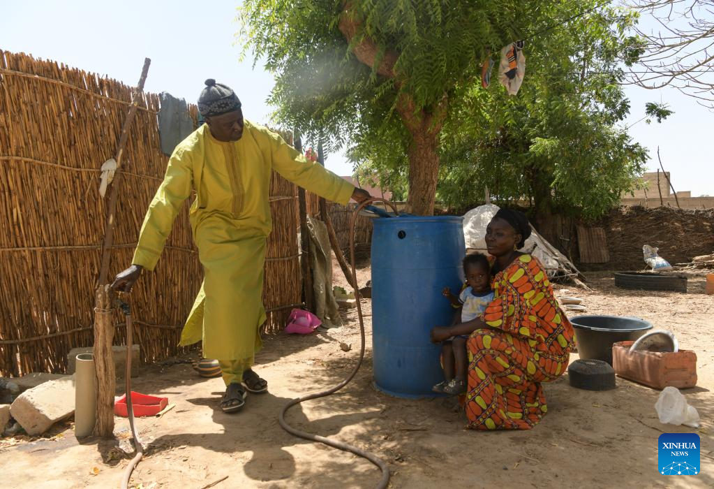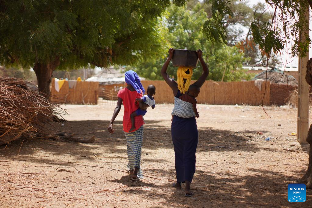 A villager carrying water is pictured on the way home in Tenefoul Toucouleur Village, Diourbel, Senegal, March 20, 2023. Mamadou Dieng, 40, an employee of the Chinese construction company CGCOC Group Senegal Branch, has been responsible for maintaining a Chinese-aided well in Tenefoul Toucouleur Village. Checking the machine's functions and filling the engine with diesel, Dieng's work may seem simple and tedious, but means a lot to the locals.