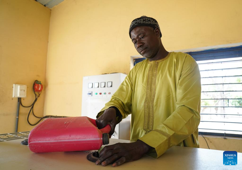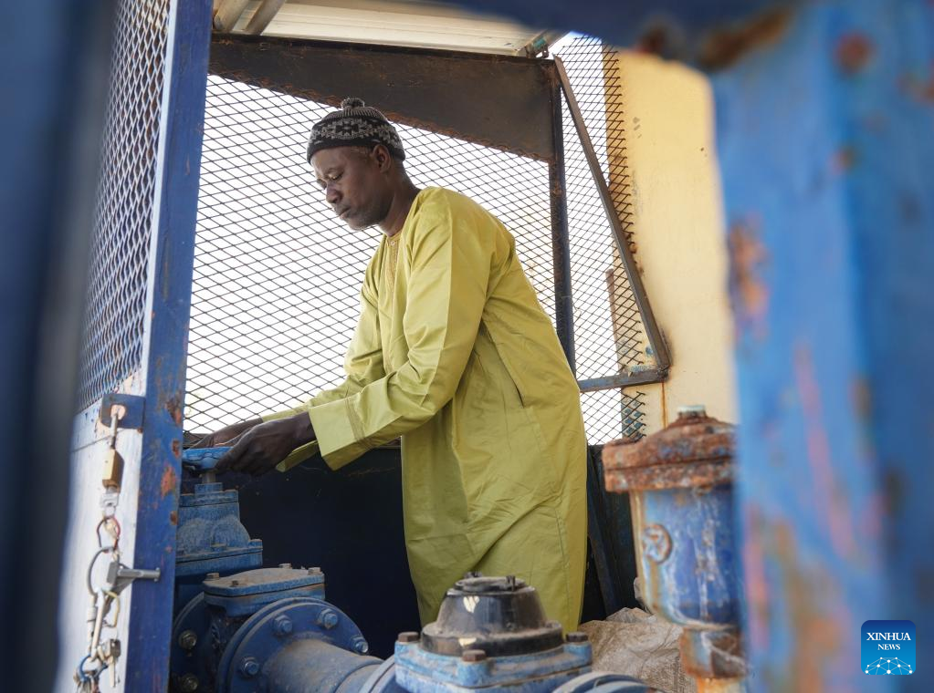 Mamadou Dieng is pictured inside the monitoring room of a well project in Tenefoul Toucouleur Village, Diourbel, Senegal, March 20, 2023. Mamadou Dieng, 40, an employee of the Chinese construction company CGCOC Group Senegal Branch, has been responsible for maintaining a Chinese-aided well in Tenefoul Toucouleur Village. Checking the machine's functions and filling the engine with diesel, Dieng's work may seem simple and tedious, but means a lot to the locals.