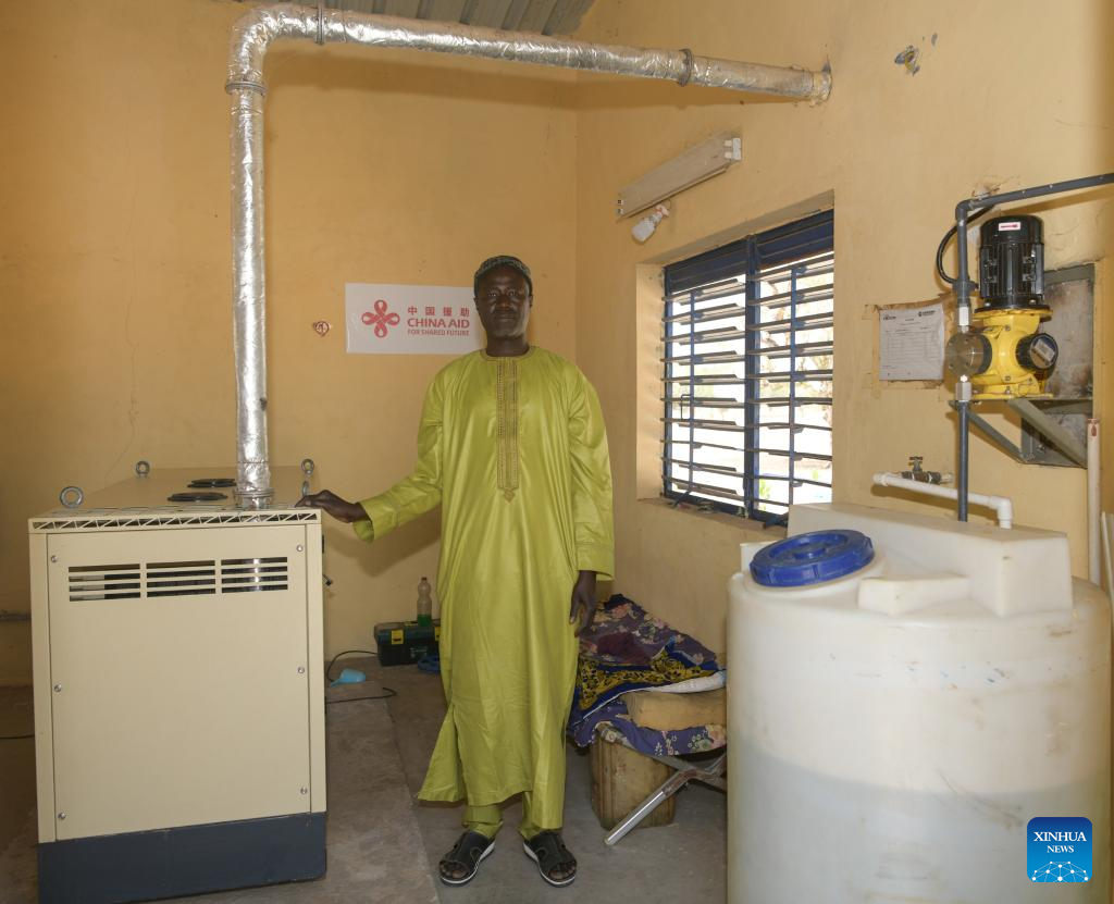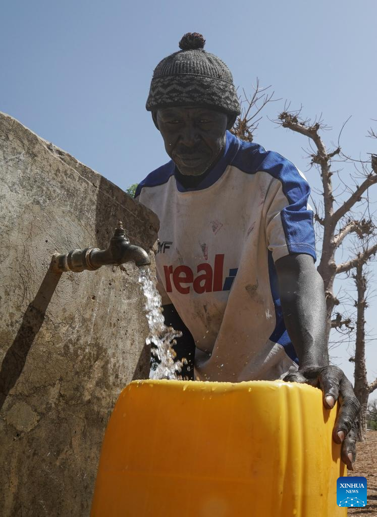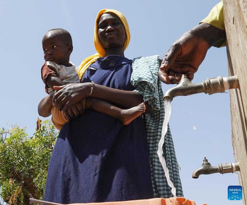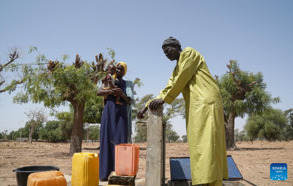A villager collects water in Tenefoul Toucouleur Village, Diourbel, Senegal, March 20, 2023. Mamadou Dieng, 40, an employee of the Chinese construction company CGCOC Group Senegal Branch, has been responsible for maintaining a Chinese-aided well in Tenefoul Toucouleur Village. Checking the machine's functions and filling the engine with diesel, Dieng's work may seem simple and tedious, but means a lot to the locals.