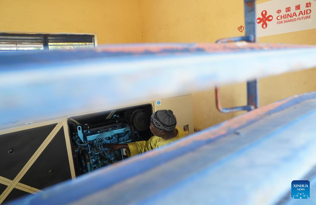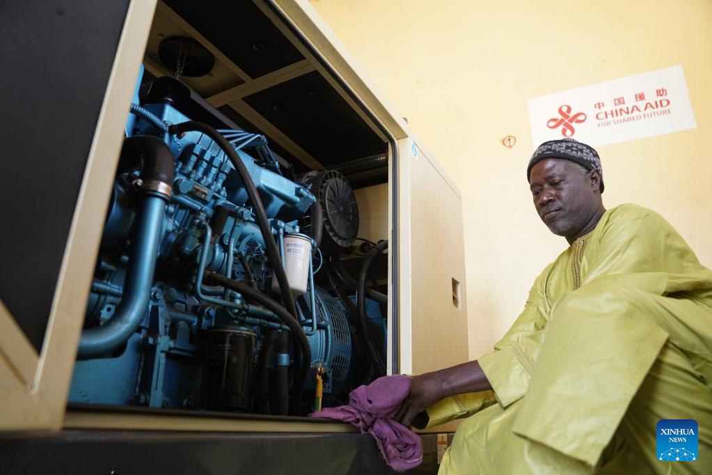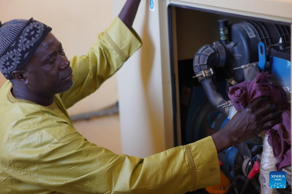 Mamadou Dieng checks the generator set of a well project in Tenefoul Toucouleur Village, Diourbel, Senegal, March 20, 2023. Mamadou Dieng, 40, an employee of the Chinese construction company CGCOC Group Senegal Branch, has been responsible for maintaining a Chinese-aided well in Tenefoul Toucouleur Village. Checking the machine's functions and filling the engine with diesel, Dieng's work may seem simple and tedious, but means a lot to the locals.