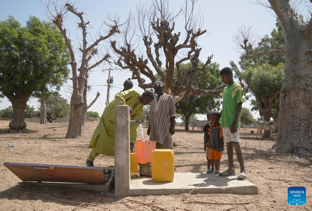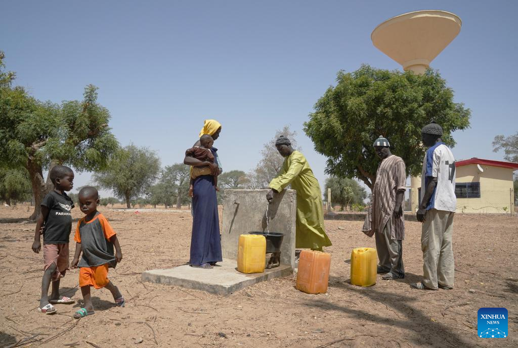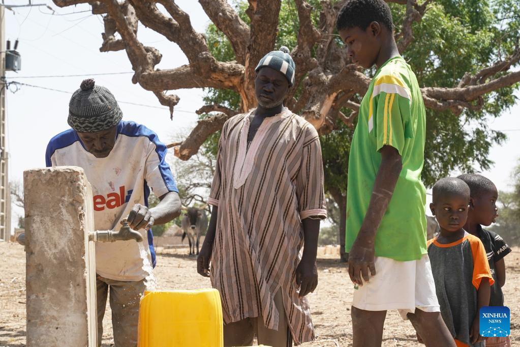 Villagers collect water in Tenefoul Toucouleur Village, Diourbel, Senegal, March 20, 2023. Mamadou Dieng, 40, an employee of the Chinese construction company CGCOC Group Senegal Branch, has been responsible for maintaining a Chinese-aided well in Tenefoul Toucouleur Village. Checking the machine's functions and filling the engine with diesel, Dieng's work may seem simple and tedious, but means a lot to the locals.