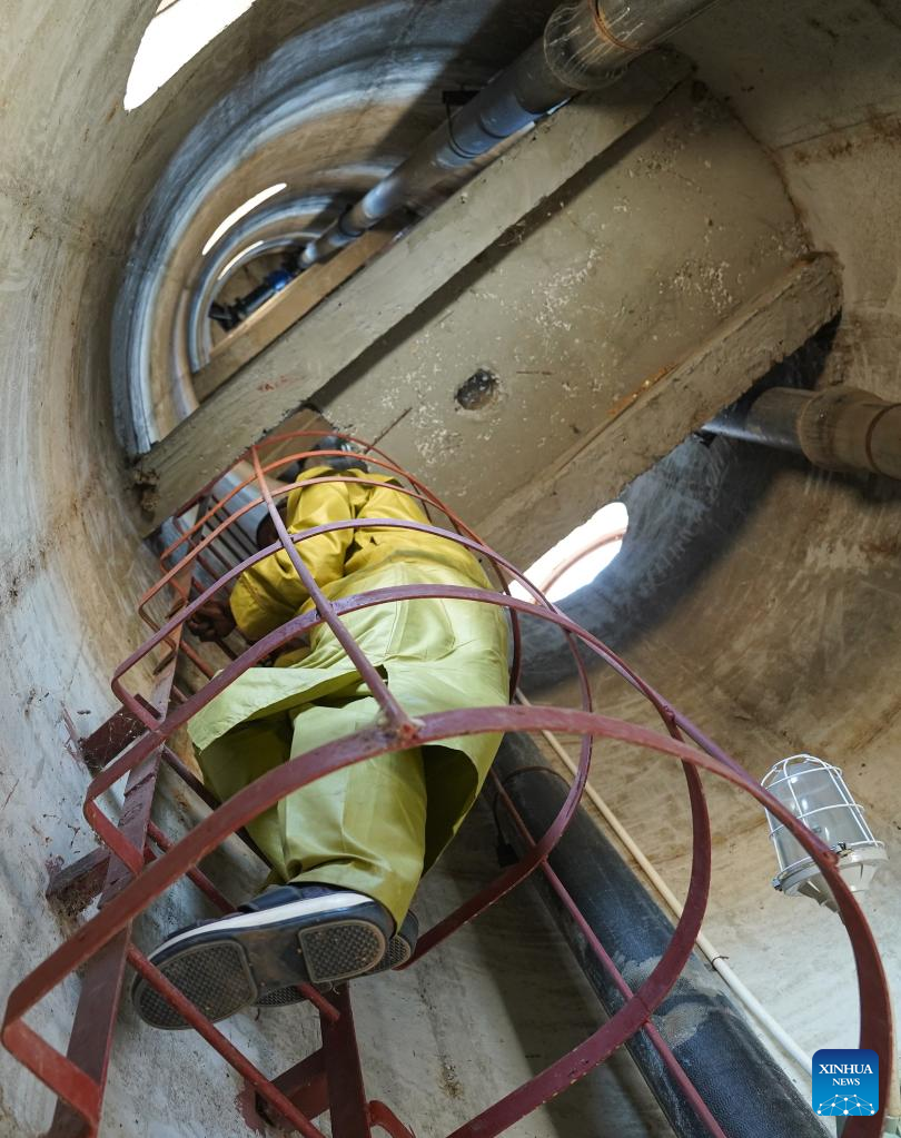 Mamadou Dieng climbs up a water tower to check and clean the water storage tank in Tenefoul Toucouleur Village, Diourbel, Senegal, March 20, 2023. Mamadou Dieng, 40, an employee of the Chinese construction company CGCOC Group Senegal Branch, has been responsible for maintaining a Chinese-aided well in Tenefoul Toucouleur Village. Checking the machine's functions and filling the engine with diesel, Dieng's work may seem simple and tedious, but means a lot to the locals.