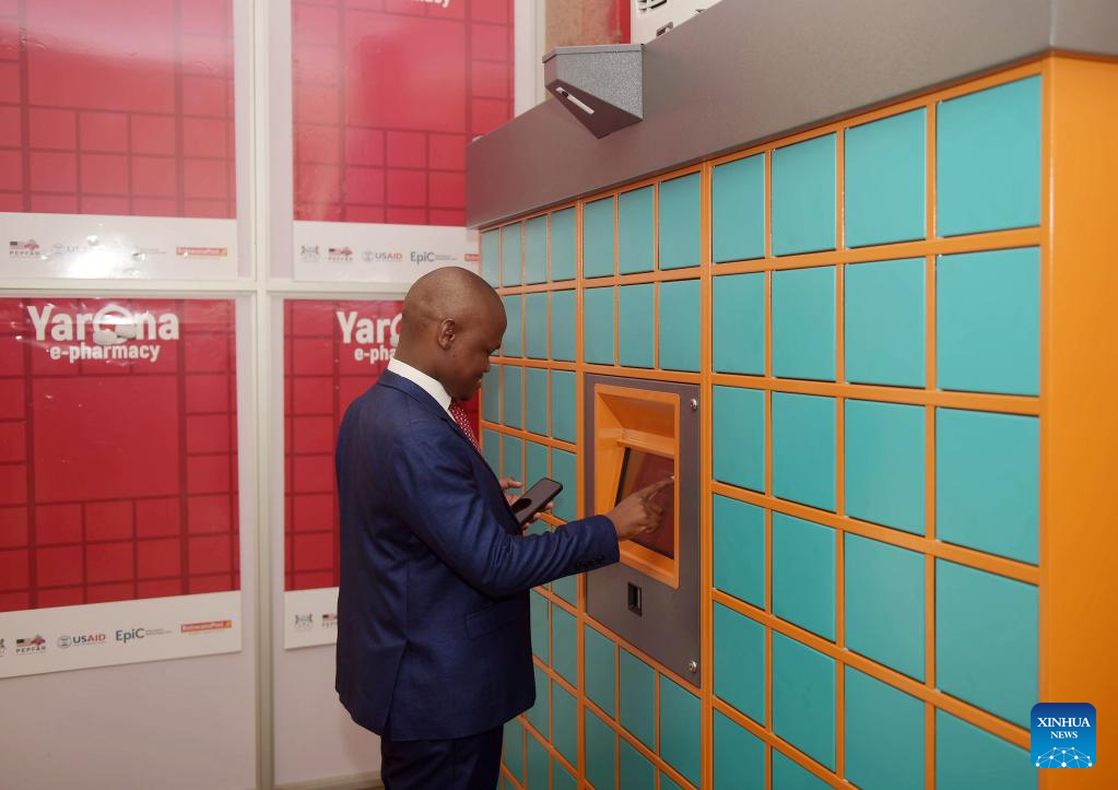 Botswana's Minister of Health Edwin Dikoloti tries a digital locker for medicine dispensing during the launch ceremony of this program in Gaborone, Botswana, March 30, 2023. Botswana's health ministry has launched a digital medicine dispensing program in Gaborone, Botswana's capital city. The e-locker program allows clients to collect medications 24 hours a day, saving them time away from work, school, or long lines at the health facilities. (Photo by Tshekiso Tebalo/Xinhua)