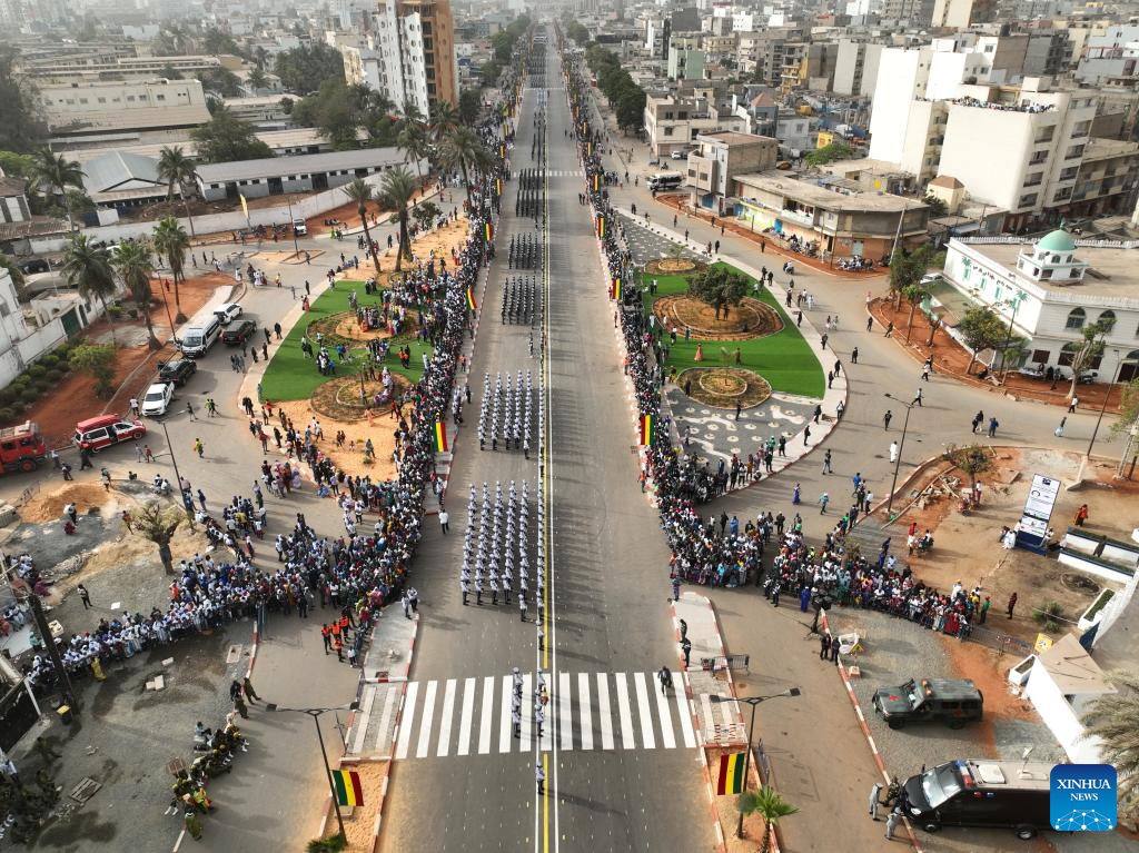 This aerial photo taken on April 4, 2023 shows a view of a military parade in Dakar, Senegal. Senegal marked its 63rd anniversary of independence with a military parade on Tuesday. (Photo by Matar Ndoye/Xinhua)