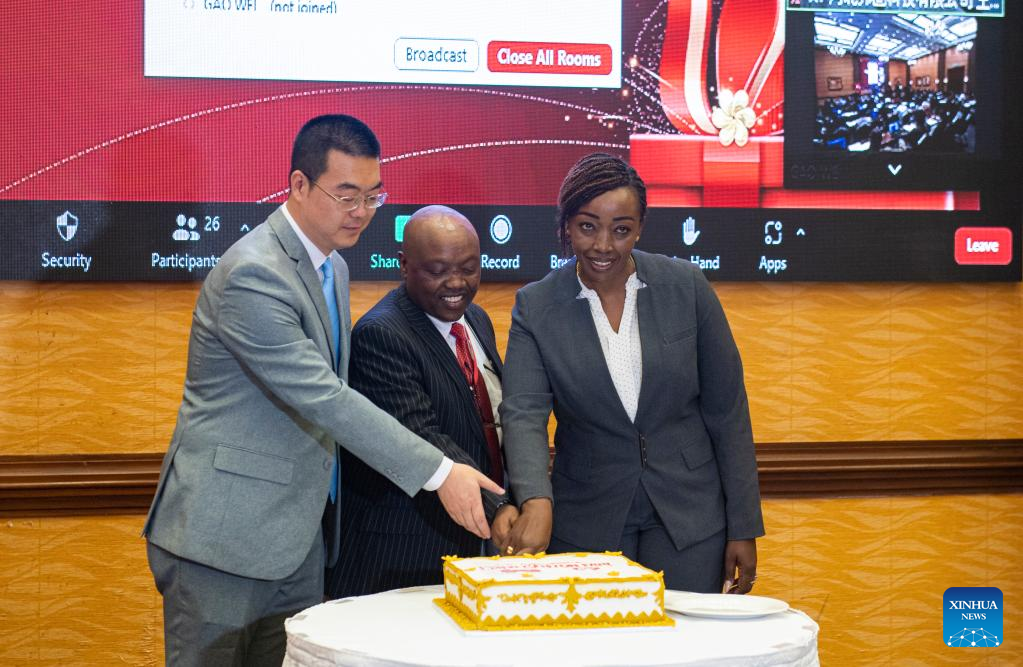 Guests cut a cake during a promotion forum for the upcoming 133rd China Import and Export Fair, also known as Canton Fair, in Nairobi, Kenya, April 12, 2023. (Xinhua/Li Yahui)